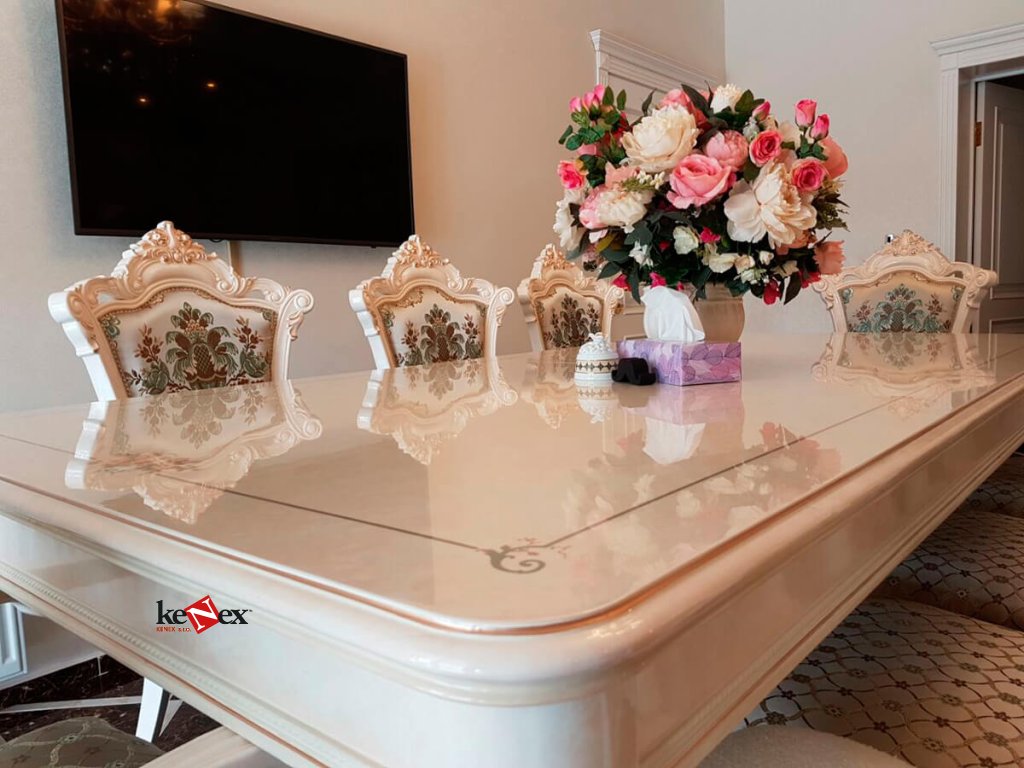 13. Transparentní měkké sklo chrání váš nábytek a na rozdíl od ostatních nátěrových hmot, nenarušuje strukturu a barvu stolu.